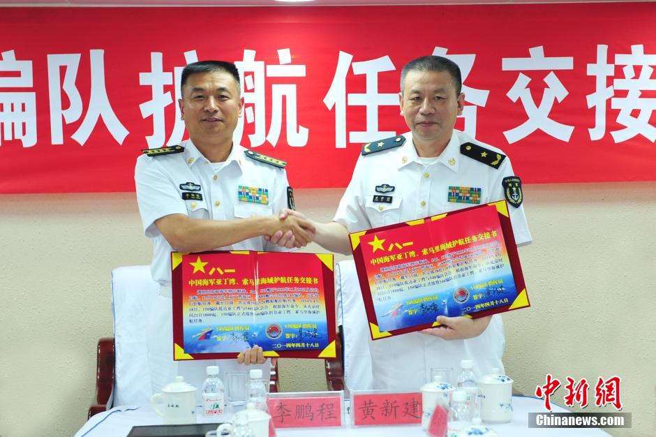 当地时间18日下午,中国海军第十六批护航编队与第十七批护航编队在亚丁湾西部海域会师,并在盐城舰举行任务交接仪式。第十七批护航编队是在执行完马航失联客机搜寻任务后,抵达亚丁湾海域的,他们将于北京时间21日18时正式接替第十六批护航编队担负亚丁湾、索马里海域的护航任务。图为双方编队指挥员交换任务交接书。中新社发 李晓 摄