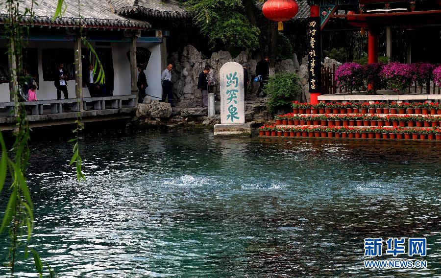 4月25日,趵突泉泉水喷涌乏力。当日,济南趵突泉水位跌至28.15米黄色警戒线,面临停喷。据了解,趵突泉水位下降主要是受降水稀少和用水量增加等因素影响,济南市水文局资料显示,2014年以来,济南市累计降水量平均为23.7毫米,比2013年同期减少21.3毫米,比常年同期的48.5毫米降水量减少24.8毫米。目前,济南市政府相关部门已采取加大限采、控采地下水力度,启动应急补源等措施。新华社记者 徐速绘 摄