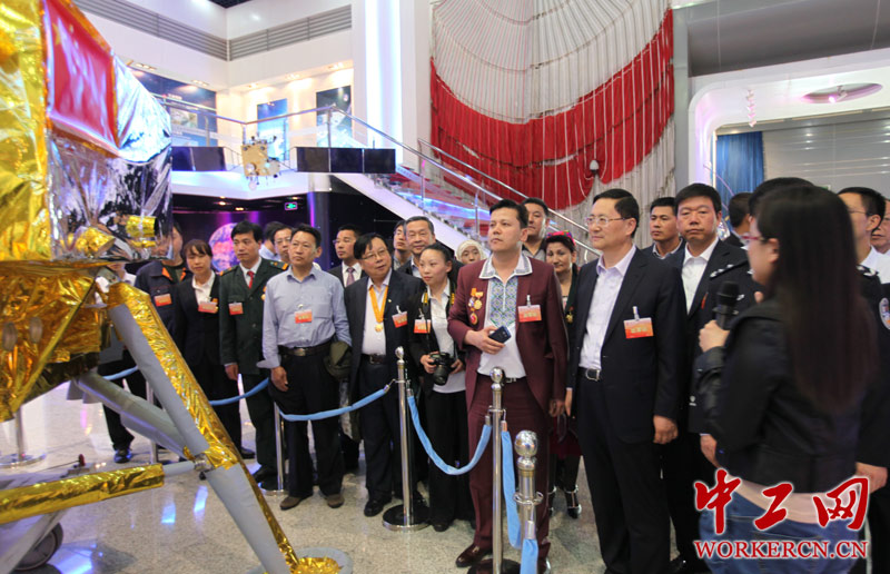 4月27日下午,近200名全国劳动模范代表,2014年全国五一劳动奖状、奖章和全国工人先锋号代表们来到了北京航天城进行参观。(中工网记者杨灵 摄)