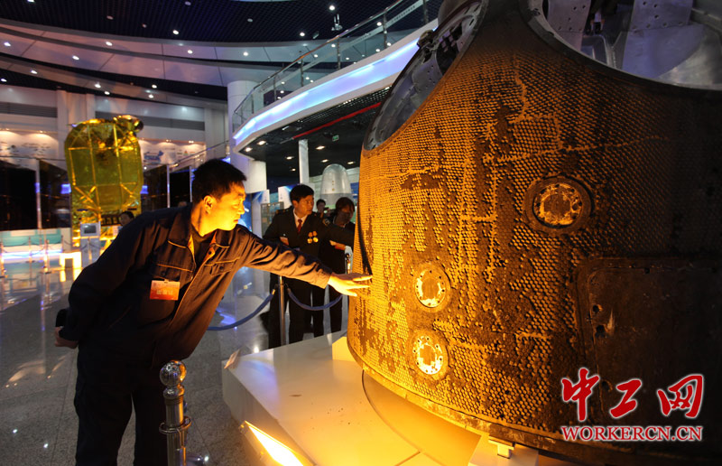 图为讲解员为“最美职工”中航工业沈阳黎明航空发动机(集团)有限责任公司发动机装配厂总装工段李志强解答问题。李志强感慨到中国的航天人真的很不容易,跟他们的辛勤努力和奉献精神是分不开的。“虽然各自的工作岗位不一样,但是我们的航天梦想是一样的。”(中工网记者杨灵 摄)