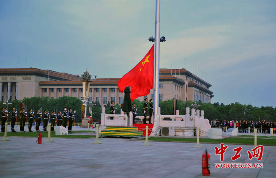 4月27日,来自全国各地的2014年全国五一劳动奖状、奖章获得者的近200名劳动模范代表来到天安门广场,观看升旗仪式、瞻仰人民英雄纪念碑、参观天安门城楼,以这种方式迎接即将到来的五一国际劳动节。雄壮的《歌唱祖国》乐曲在5时18分响起,国旗护卫队队员迈着坚实有力的步伐从天安门城楼列队走出,气宇轩昂地跨过金水桥,越过长安街,向天安门广场走来。(中工网记者杨灵 摄)