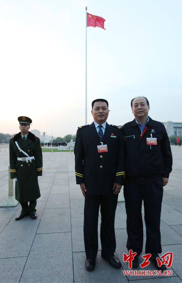 “最美工人”北京市地铁运营有限公司运营三分公司乘务员廖明和中航工业沈阳黎明航空发动机(集团)有限责任公司发动机装配厂总装工段李志强合影留念。(中工网记者杨灵 摄)