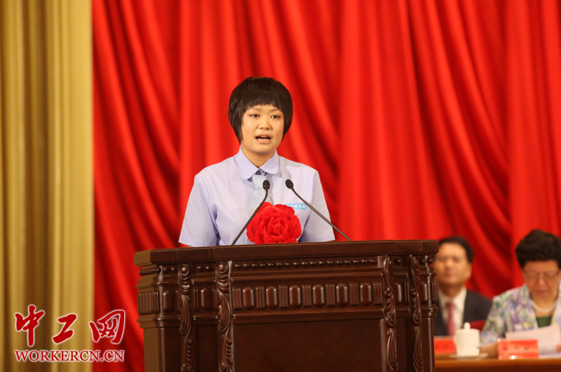 图为全国工人先锋号获奖集体代表、中建五局隧道公司雀儿山隧道项目部技术员陈觅杭作大会发言。(中工网记者杨灵 摄)