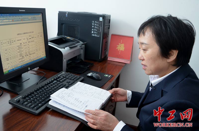 高馨在她的“会馨家园”工作室里整理资料。高姨自己不太会用电脑,平时她把接触到的单身男女信息记到脑子里、写在笔记本上,工作室里有志愿者帮她把这些资料整理到电脑里、上传到会馨家园交友网上。 (中工网记者 笑语摄)