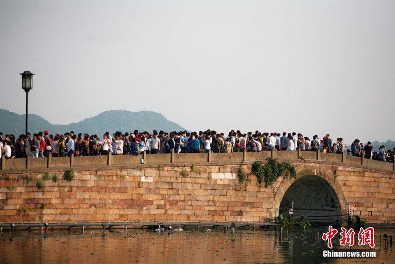 5月1日,五一小长假首日,杭州西湖景区迎来八方宾客。断桥景点,游人比肩接踵,只见人头不见桥头。中新社发 李晨韵 摄