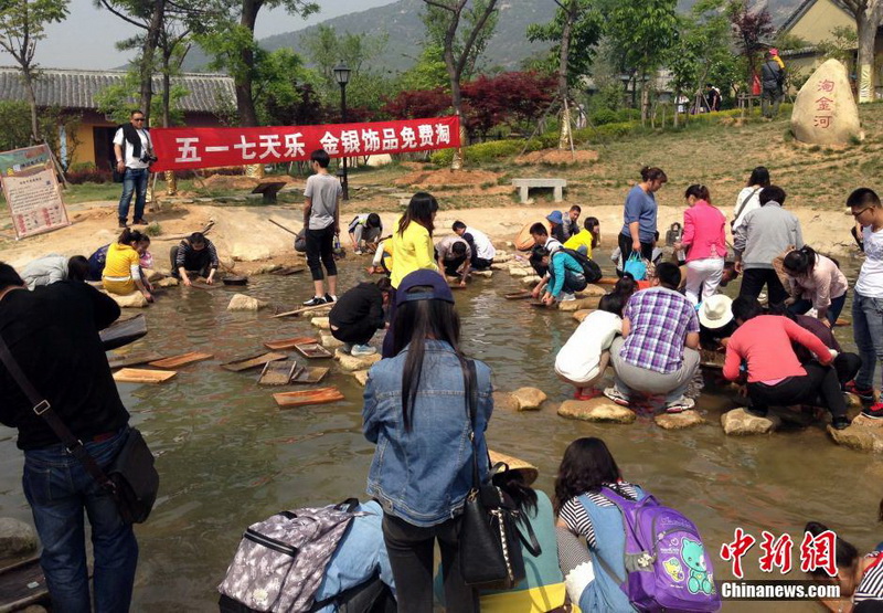 5月1日,五一小长假首日,“金都”山东招远淘金小镇的工作人员向景区淘金河内抛洒了价值10万元人民币的真金颗粒及金银首饰,吸引数千游客争抢。景区当天还举办镇长嫁女等“穿越”活动。张颖超 摄