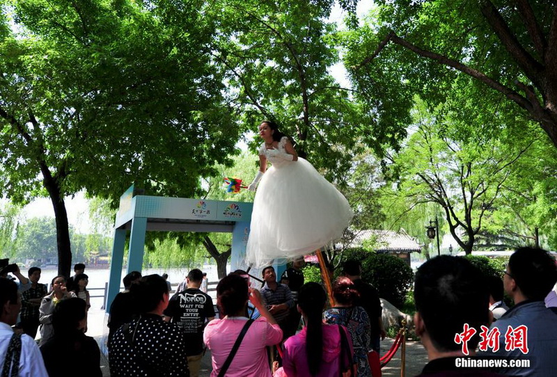 5月1日,“美女不倒翁”送游客风车。当日,一尊5米高真人版“美女不倒翁”现身济南大明湖畔,高空探身向游客派发礼物,惊险动作不时引来游客阵阵惊呼。中新社发 张勇 摄