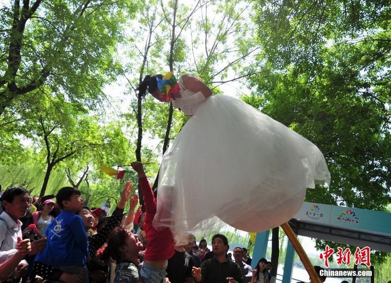5月1日,“美女不倒翁”送游客风车。当日,一尊5米高真人版“美女不倒翁”现身济南大明湖畔,高空探身向游客派发礼物,惊险动作不时引来游客阵阵惊呼。中新社发 张勇 摄