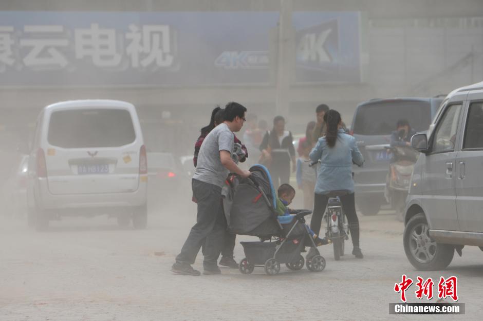 5月1日,山西太原,民众在沙尘天中出行。当日,中央气象台继续发布沙尘暴蓝色预警,在“五一”劳动节小长假期间,中国北方许多地区迎来降温沙尘天气。中新社发 武俊杰 摄