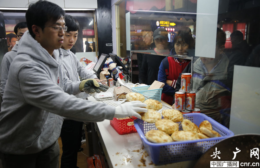 2014年4月20日,北京,宋鑫(前)在烤饼,孟兵在招呼顾客,并递送肉夹馍等。