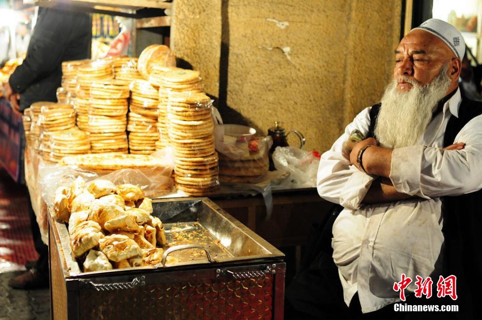 5月4日晚,乌鲁木齐二道桥夜市汇集烤全羊、羊蹄子、面肺子、烤包子、羊肉串等新疆美食,供食客享用。一位老人在出售烤包子、烤馕饼。马新龙 摄