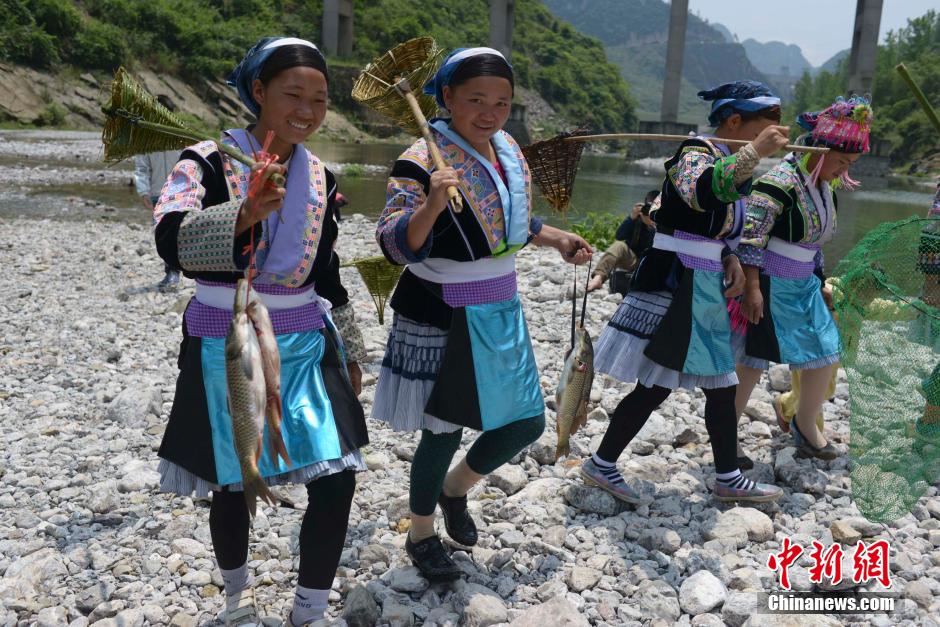 5月10日,在贵州省开阳县清水江两岸,千余名苗族同胞欢庆共度杀鱼节。杀鱼节是高寨苗族同胞隆重而盛大的活动,带有浓厚的原始群居狩猎的生活遗风。杀鱼节,先是由“约头”(苗族寨中威望较高的人)确定节日期辰,号令沿河两岸的苗族同胞参加活动并主持仪式。图为贵州苗族同胞正在清水江畔进行叉鱼节活动。中新社发 杨舰 摄