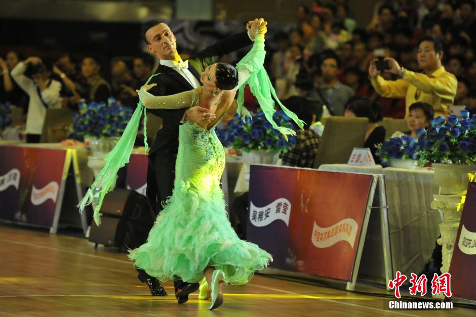 2014贵州省“体育彩票杯”第十二届体育舞蹈锦标赛暨全国体育舞蹈邀请赛于5月10日至11日在贵州都匀举行,吸引了中国、意大利、俄罗斯、法国等国家和地区的3000余名标准舞、拉丁舞的舞蹈爱好者参与。图为比赛精彩瞬间。中新社发 张伟 摄