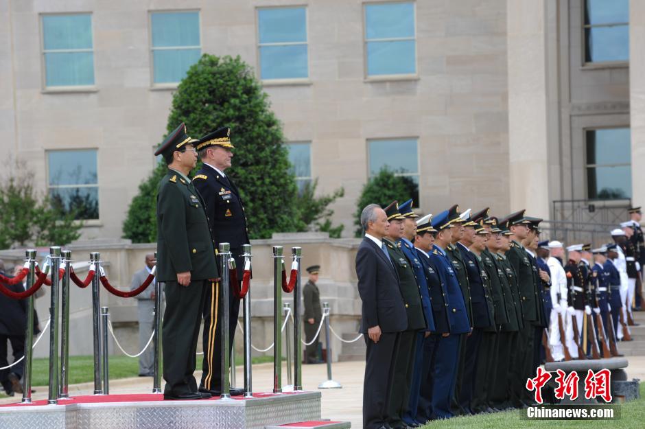 中国人民解放军总参谋长房峰辉当地时间15日访问五角大楼,并与美军参联会主席邓普西举行会谈。图为美方在会谈前为房峰辉举行高规格欢迎仪式。