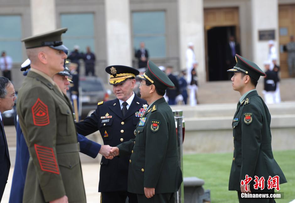 中国人民解放军总参谋长房峰辉当地时间15日访问五角大楼,并与美军参联会主席邓普西举行会谈。图为美方在会谈前为房峰辉举行高规格欢迎仪式。
