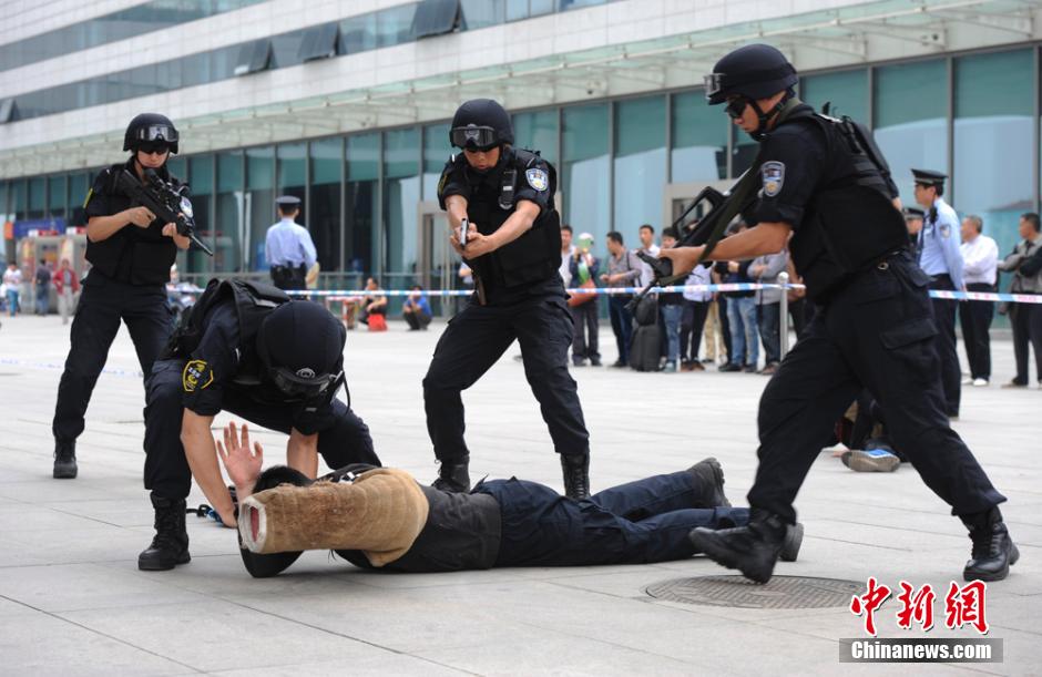 5月15日,南京警方在京沪高铁南京南站举行反暴恐实战演练,出动百余名民警、防暴装甲车等,通过将欲制造暴力恐怖袭击的持刀“暴恐分子”制服“击毙”的整个过程,充分检验南京警方街面特警武装巡逻警力快速反应、灵活机动、协同作战的能力,维护一方平安。宁公轩 摄