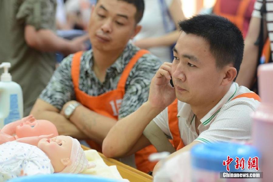 5月23日,湖南省儿童医院首季“超级奶爸”训练营正式开训,40名“菜鸟”奶爸现场囧态百出。据了解,此次训练营是由湖南省儿童医院新生儿专家团队全程免费教学,为奶爸们重点培训婴幼儿的抱姿、喂奶、换尿片、挑选生活用品等吃、穿、住、行、医五个方面20余项育儿理论与操作技能。 杨华峰 摄