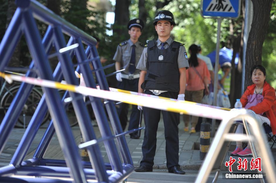 6月7日,民警在北京八中校门前执勤,为考生保驾护航。当日,2014年全国高考拉开帷幕。据统计,今年全国高考报名人数为939万人,较2013年增加27万人,增幅3%。全国高校计划招生698万人,其中本科363万人,高职(专科)335万人。图为八中考点外公安民警、武警、城管、交警协同护航保障。中新网记者 金硕 摄
