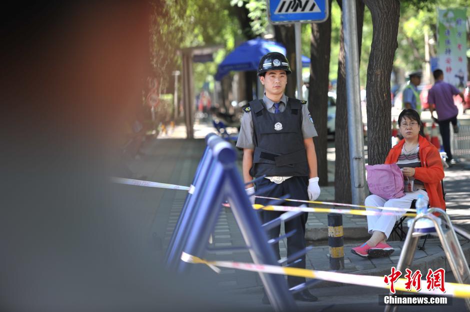 6月7日,民警在北京八中校门前执勤,为考生保驾护航。当日,2014年全国高考拉开帷幕。据统计,今年全国高考报名人数为939万人,较2013年增加27万人,增幅3%。全国高校计划招生698万人,其中本科363万人,高职(专科)335万人。图为八中考点外公安民警、武警、城管、交警协同护航保障。中新网记者 金硕 摄