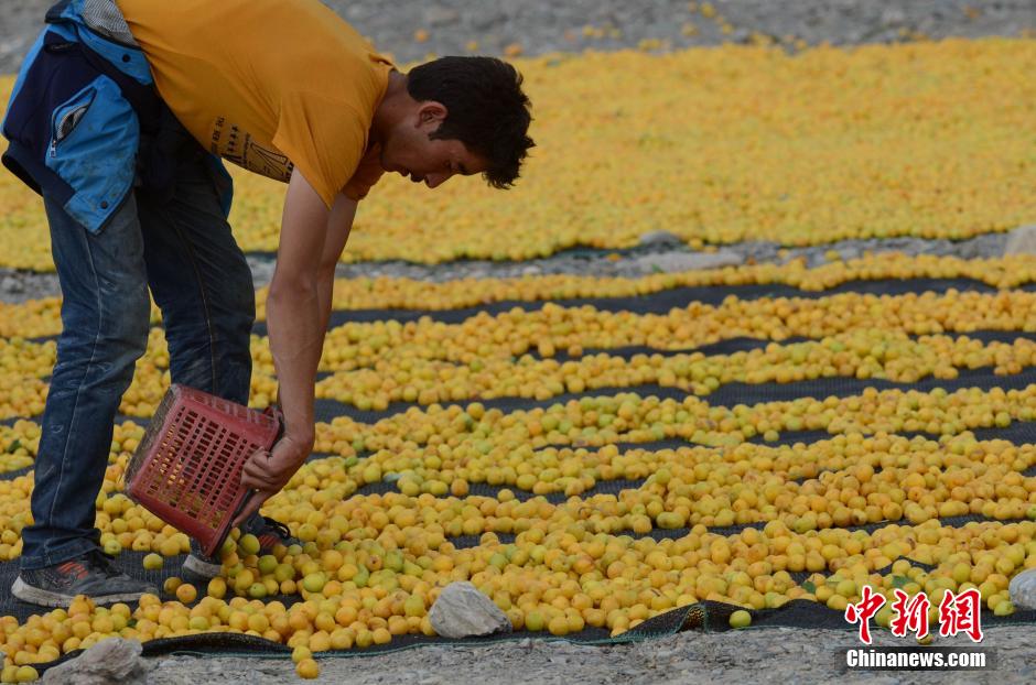 又到一年一度杏子成熟的季节了,6月27日,新疆轮台县铁热克巴扎乡曼曲鲁克村3组农民阿里木·木沙家在沙滩上晾晒杏子。轮台县新疆南疆产杏大县,享有“中国小白杏之乡”的美誉。