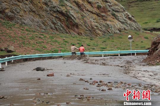 由于连降暴雨新疆省道221线塔尔根山区路段遭遇十年罕见洪水.图为托里公路局技术人员赤脚勘察道路受灾情况。 木沙尔 摄