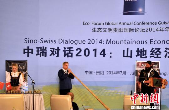 7月10日下午,主题为“山地经济,绿色发展”的中瑞对话2014在贵阳国际生态会议中心举行,来自各国的与会代表们在开幕式结束之后又各自参加了四个平行子论坛,最后,闭幕式上,来自瑞士的艺术家们载歌载舞,把这次“山与山的对话”推向了高潮。严光辉 摄