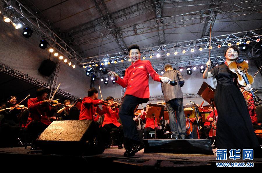 7月14日,在巴西福塔莱萨,中国浙江交响乐团演奏员王杨(前右)、李晨啸(前左)与乐队一起演奏巴西音乐《伦巴达》。