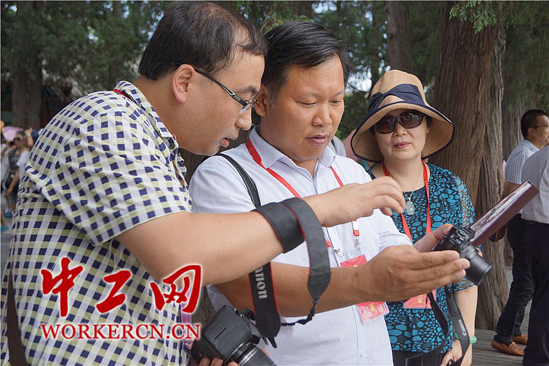 图为来自黑龙江中航工业哈尔滨飞机工业集团有限责任公司数控加工中心的工人秦世俊正在和一同参加休养的劳模探讨刚拍的照片。中工网记者 葛姗 摄