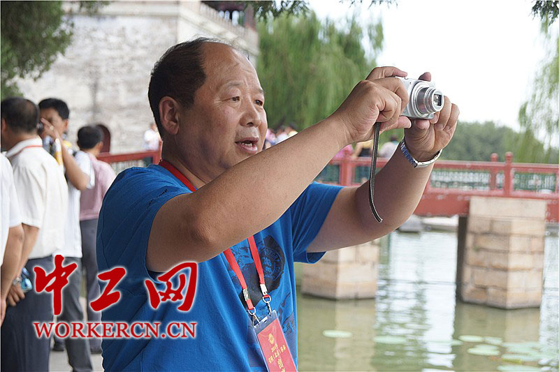 图为来自吉林长春市一零八中学校长李铁成正拿相机记录下颐和园昆明湖美景。他说:“非常荣幸作为基层代表能参加此次劳模休养活动,要多照些照片回去给老师们看。” 中工网记者 葛姗 摄