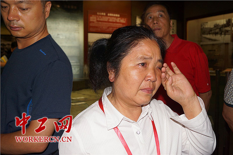 在中国人民抗日战争纪念馆,每一位劳模都在细细观摩,沉浸在那段屈辱的岁月里。图为来自安徽阜阳公共交通总公司售票员答朝荣在观摩展览中落下了眼泪。她说:“看了展览,心情非常沉重。,勿忘国耻,我们一定要珍惜今天的好生活。” 中工网记者 葛姗 摄