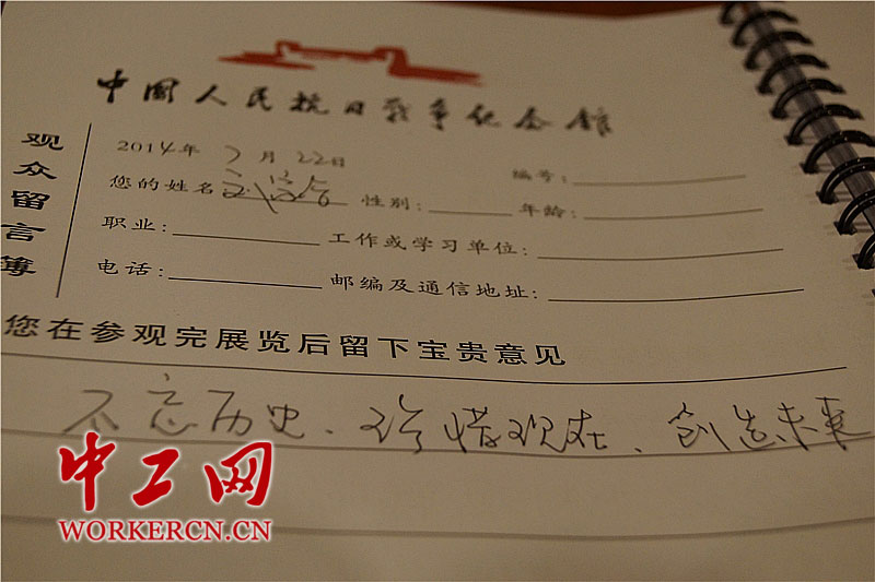 图为劳模代表刘家合在观众留言本上留下了自己想说的话:“不忘历史,珍惜现在,创造未来。” 中工网记者 葛姗 摄