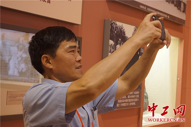 图为来自江苏无锡客运有限公司班长秦向锋,他颇有感触地告诉记者:“我要把这些照片带回去整理,让我们班的同志们也一起看一看。” 中工网记者 葛姗 摄