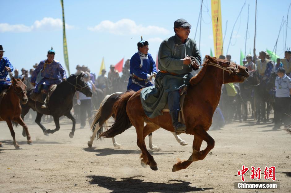 7月25日,蒙古族骑手在那达慕开幕式上快马加鞭进入场地。当日,内蒙古自治区第25届旅游那达慕在乌兰察布市四子王旗开幕,在为期一周的那达慕上,除了传统搏克、赛马、射箭比赛项目以外,还将举办草原美食啤酒节、蒙古族长调演出、制作马奶酒与3D艺术画展等活动。中新社发 刘文华 摄