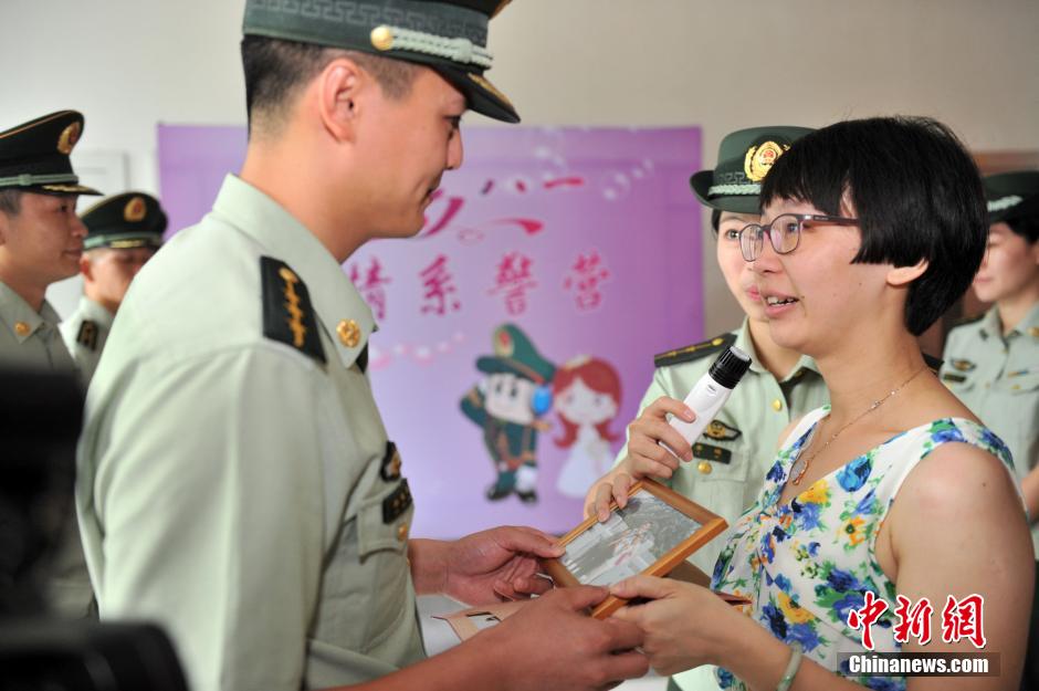 8月1日,在厦门后井保税港区警务室,军嫂们被请到了警营,与边防官兵进行七夕“鹊桥会”,并互赠礼物,互诉心声,互表爱意。中新社发 吕明 摄