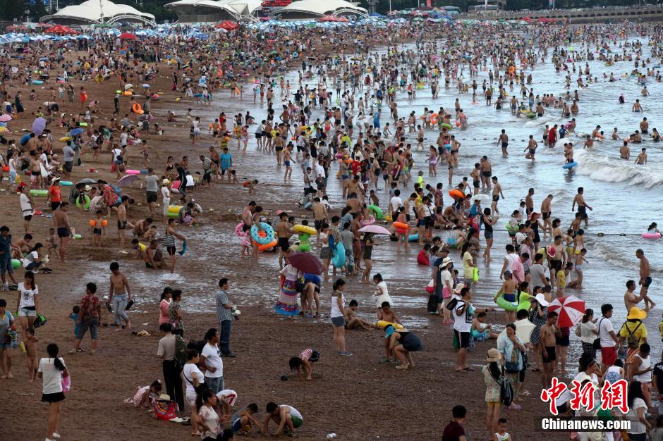 8月2日,青岛第一海水浴场游客爆满,人流如潮。连日来,青岛迎来高温天,各大海水浴场迎来大批洗澡消暑的游客,最热门的第一海水浴场一天纳客20多万人次,火热爆棚的场面如同“下饺子”般热闹。 中新社发 徐崇德 摄