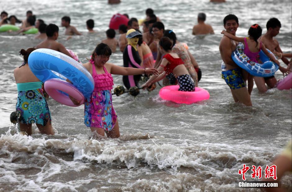 青岛第一海水浴场游客爆满 场面如同“下饺子”