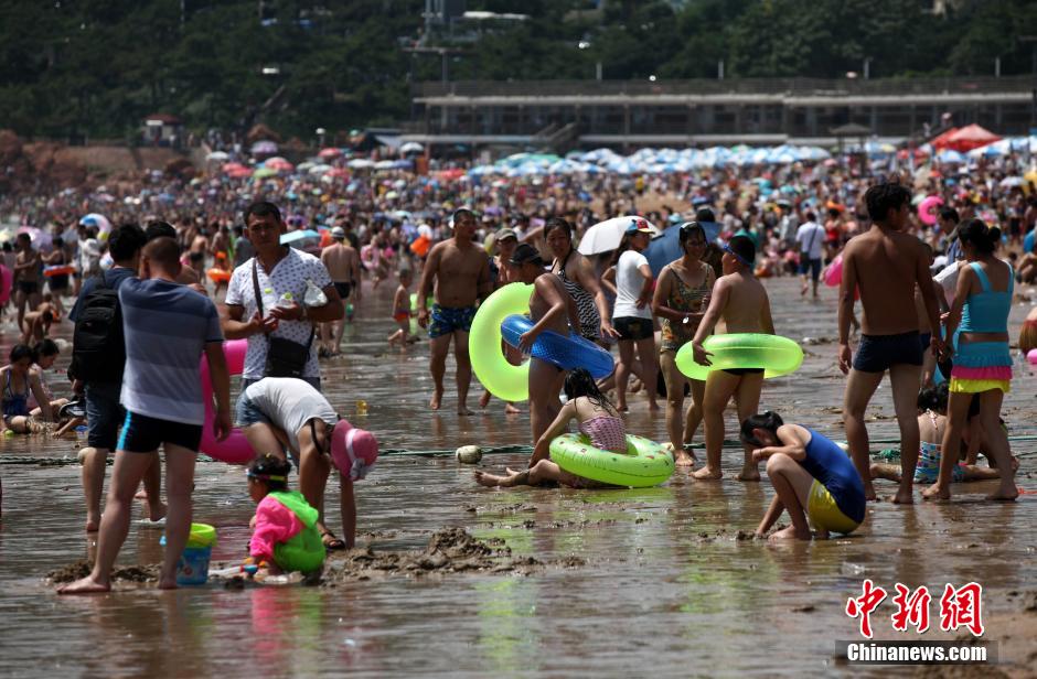 8月2日,青岛第一海水浴场游客爆满,人流如潮。连日来,青岛迎来高温天,各大海水浴场迎来大批洗澡消暑的游客,最热门的第一海水浴场一天纳客20多万人次,火热爆棚的场面如同“下饺子”般热闹。 中新社发 徐崇德 摄