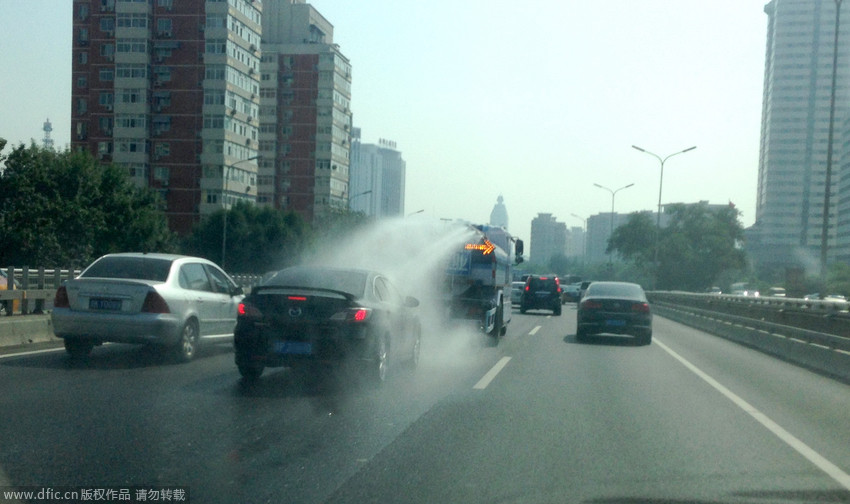 2014年8月7日上午9时左右,在北京天宁寺桥上,一辆洒水车在前方洒水作业,后面紧紧跟着一辆小汽车,借着洒水车洒出来的水进行洗车。在跟进100米左右后,开着转向车灯离开,但随后又有其他车辆紧随其后蹭水洗车,由于路况不是很好,车辆走走停停,跟在洒水车后面的车辆又被水雾笼罩,很容易发生追尾事件。东方IC
