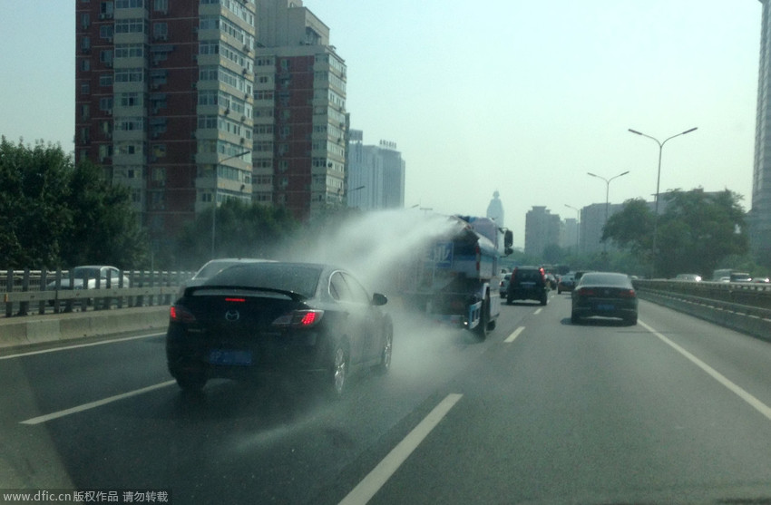 2014年8月7日上午9时左右,在北京天宁寺桥上,一辆洒水车在前方洒水作业,后面紧紧跟着一辆小汽车,借着洒水车洒出来的水进行洗车。在跟进100米左右后,开着转向车灯离开,但随后又有其他车辆紧随其后蹭水洗车,由于路况不是很好,车辆走走停停,跟在洒水车后面的车辆又被水雾笼罩,很容易发生追尾事件。东方IC