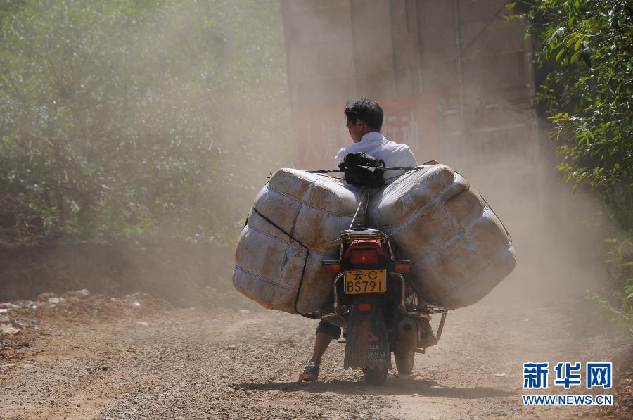 8月8日,在鲁甸县龙头山镇附近一处道路上,受灾群众用摩托车转运物资。由于道路破坏严重,一辆辆摩托车成为鲁甸地震灾区特殊而有效的救援运输工具,它们可以到达很多大型车辆无法到达的地方,完成物资运送“最后一公里”。受灾群众用摩托车转运干净的水和食品到家中,也运送救援人员、受灾群众家属和记者进出灾区。新华社发(卢志佳 摄)
