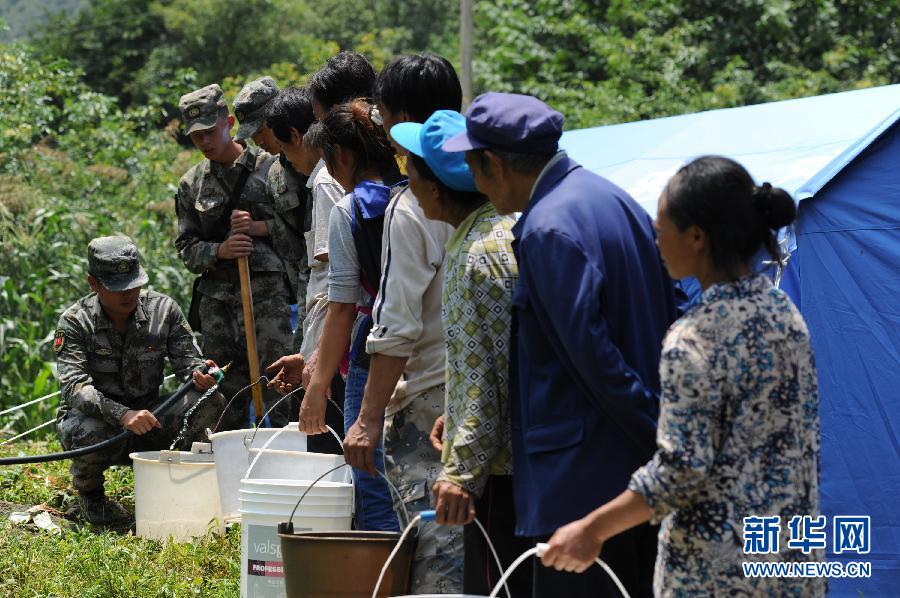 8月8日,受灾群众在坪地村集中安置点排队接水。鲁甸地震发生后,重灾区云南省巧家县新店镇坪地村水渠被毁,水窖震裂。除了救灾矿泉水,受灾群众已“断水”多日。7日,第13集团军某红军师官兵在离村子约5公里处找到水源,从半山腰引出水管。8日,“自来水”流到了集中安置点,大大缓解了受灾群众的用水困难问题。新华社记者 陶亮 摄