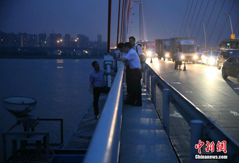 图为武汉警方谈判专家正在与翻爬至大桥外侧护栏的劫持者谈判。