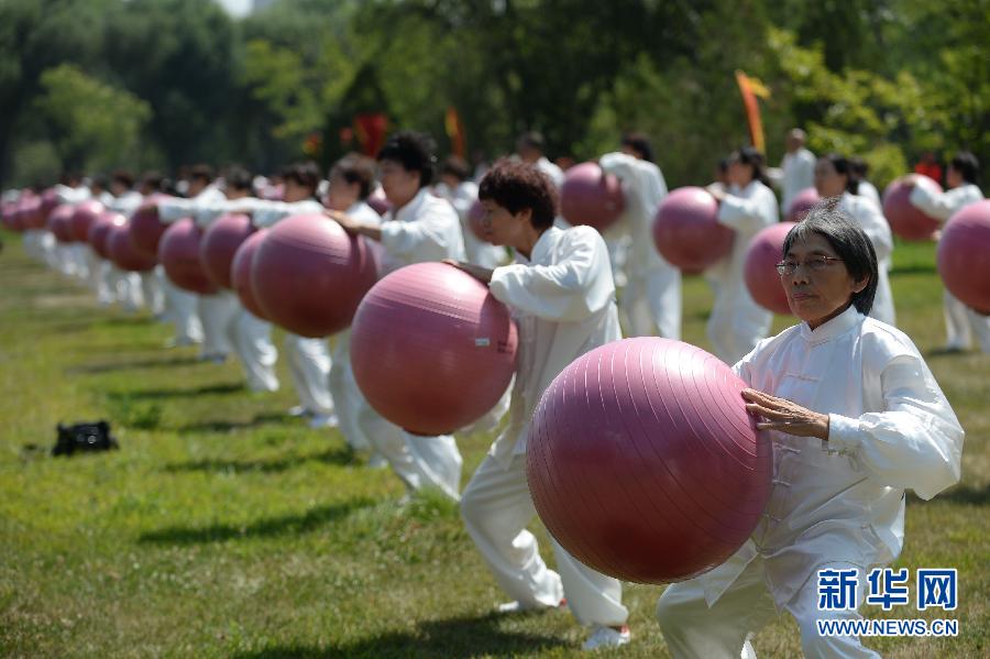 8月8日,市民在健身日活动中进行太乙球表演。当日,沈阳市万众健身系列活动在沈阳市浑河两岸浑河桥至富民桥段举办,4000余名市民通过瑜伽、太乙球、自行车、赛龙舟、动力伞等健身活动全方位展示全民健身成果。新华社记者潘昱龙摄