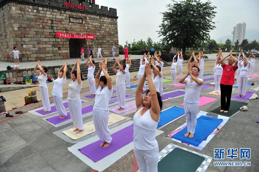 8月8日,瑜伽爱好者在湖北省秭归县屈原祠景区南门广场练习瑜伽。当日是我国第六个全民健身日,各地市民以练习健身操、武术、瑜伽等方式快乐运动,享受生活。 新华社发(王辉富 摄)