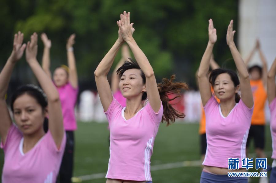 8月8日,市民们正在表演集体舞。当日是我国第六个“全民健身日”,江西南昌组织了太极拳、少儿跆拳道、千人棋牌等活动,用群体体育项目展现市民的健康风采。 新华社记者周密摄