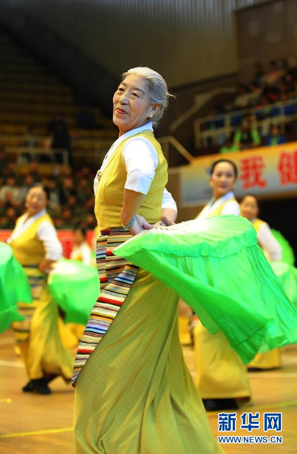 8月8日,68岁的琼拉在表演健身秧歌舞。