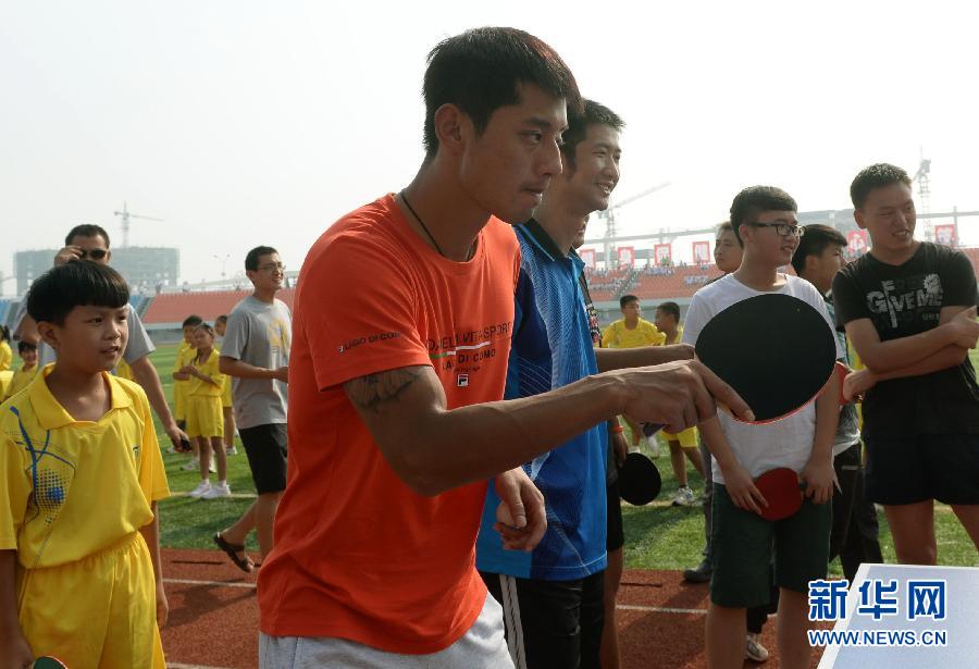 8月8日,奥运冠军张继科与乒乓爱好者互动。当日,数位乒乓球世界冠军在山东微山县参加全民健身日活动,并与当地乒乓球爱好者互动,为全民健身日加油助威。 新华社记者朱峥摄