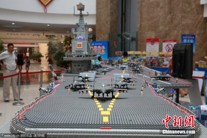 2014年8月10日,辽宁省沈阳市,一艘由44万余块积木组成的“辽宁号”航母模型在沈阳展出。该模型全长9.02米、宽1.78米、高1.6米,重686公斤,由6名工作人员用时180天安装完成,所用积木总量达443800块。图片来源:CFP视觉中国