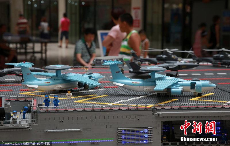2014年8月10日,辽宁省沈阳市,一艘由44万余块积木组成的“辽宁号”航母模型在沈阳展出。该模型全长9.02米、宽1.78米、高1.6米,重686公斤,由6名工作人员用时180天安装完成,所用积木总量达443800块。图片来源:CFP视觉中国