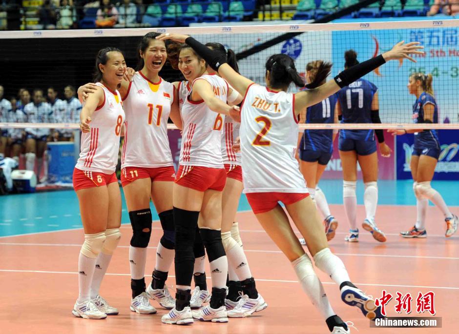 8月10日,2014年世界女排大奖赛香港站的比赛下午继续在香港体育馆举行,中国女排以局数三比一战胜意大利,三战全胜,赢得冠军。中新社发 谭达明 摄